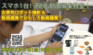【満員御礼 受付終了】2026年3月27日(金)@練馬スマホ1 台で出来る「動画編集教室1 DAY スクール」を開催。鈴茂器工とのコラボ企画。お寿司ロボットなどを撮影しておもしろ動画を創ろう!の回